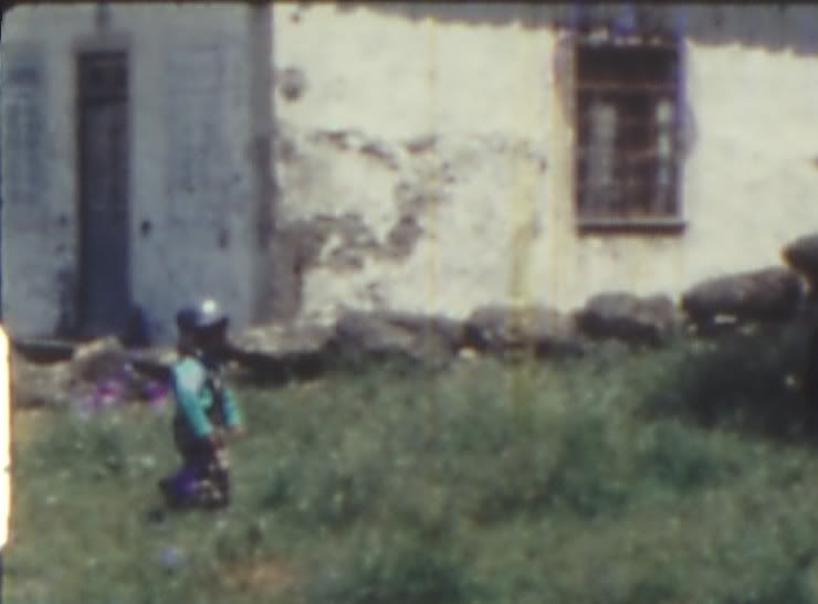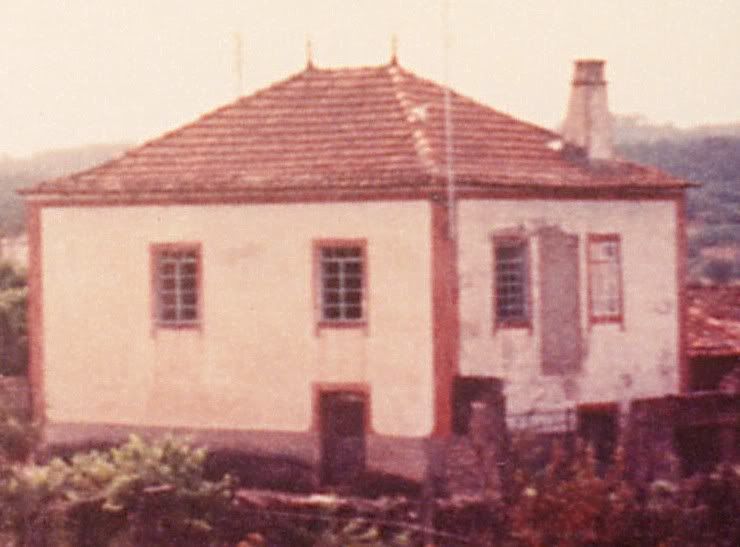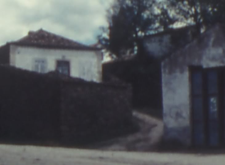 - À esquerda: Fotograma do filme caseiro de 1976, a que já aludimos no blog AQUI. Observamos em primeiro plano a já desaparecida garagem, onde hoje é a Associação, e em segundo plano a casa que apresenta duas janelas pintadas, uma de cada lado da porta. Tudo o que observa nesta foto já desapareceu.