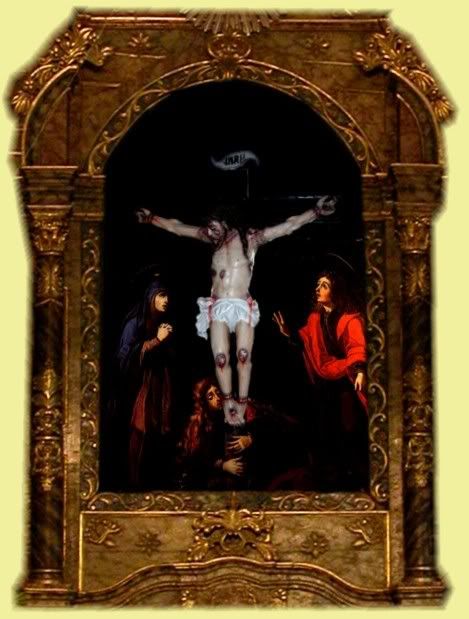 - Montagem: Imagem do Santo Cristo, existente na igreja dos Forcalhos, sobre pintura de Josefa de Óbidos, emoldurada por parte da talha do altar-mor, também da igreja dos Forcalhos.